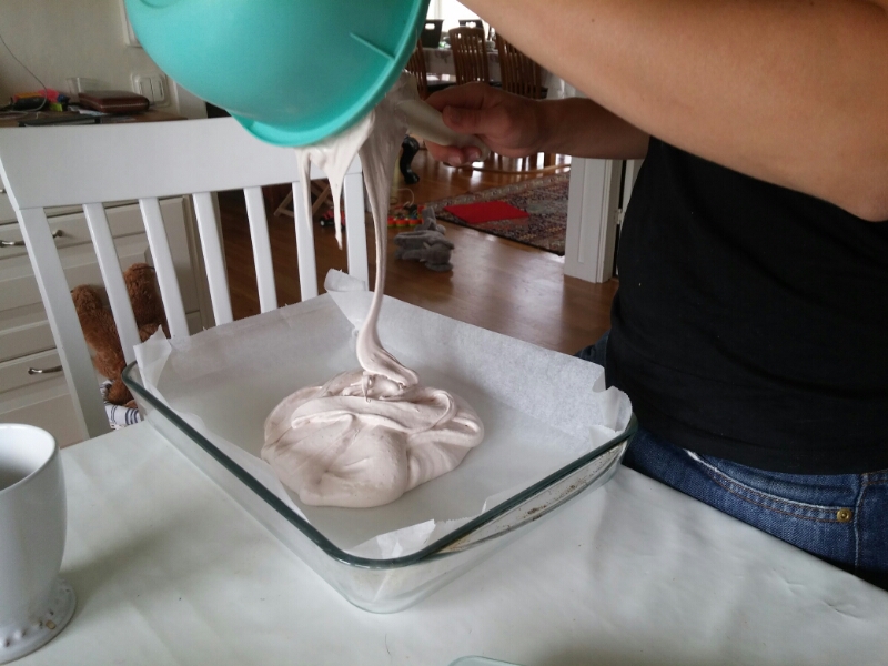 Vispa två äggvitor till hårt skum. Häll dem varma sockerlagen i skummet, lite i taget. Fortsätt vispa och vispa i ca 10 minuter. Smeten ska då ha svalnat helt.