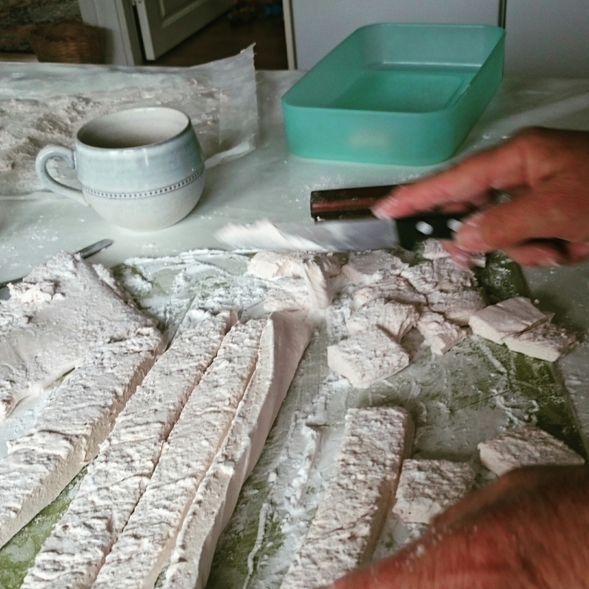 Pudra en skärbräda och lägg över marshmallowsen på denna. Använd en degskrapa för att få loss den från bakplåtspappret. Skär i bitar och doppa och rulla dem i pudret.