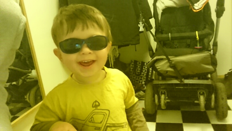 Nöjd Wilfred som hittade solglasögon i nya kistan.