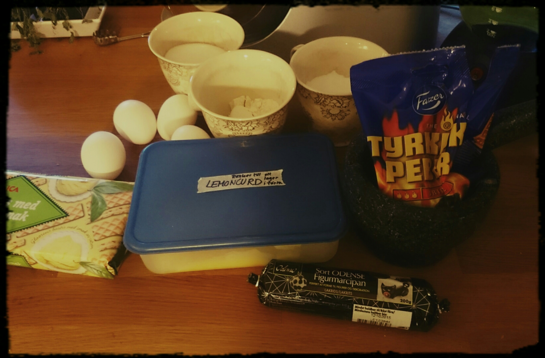 - kex eller annat till finishen på tårtan (i och med att lakritsmarsipansrullen inte räcker till ett helt tårtlock…)